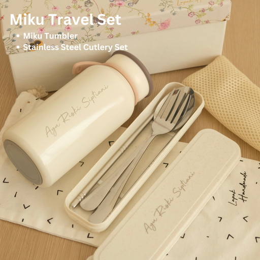 Miku Travel Set: Miku Tumbler in Cream Stainless Steel Cutlery Set Sudah termasuk: Custom grafir pada produk Kotak kado eksklusif Kartu ucapan ...
