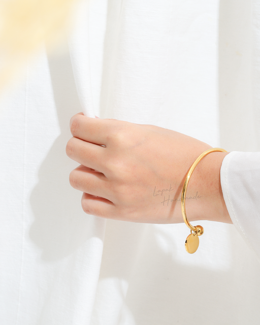 Coin Bangle, gelang dengan liontin klasik berbentuk koin yang memiliki arti keberuntungan. Bisa ditambahkan ukiran tulisan nama kamu dikedua sisi l...